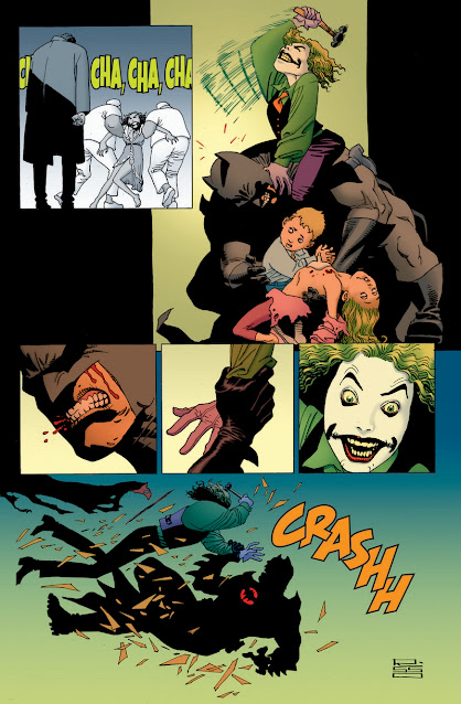 Druga ważna „inna opowieść” tego albumu jest nieco lepsza. Trzyczęściowa historia „Batman. Knight of Vengeance” z drugiej połowy 2011 roku powstała już jakiś czas po zakończeniu „100 naboi”. Należy ona do wielkiego wydarzenia, które totalnie odmieniło uniwersum DC Comics – „Flashpoint” (w styczniu 2023 przyjrzę się temu eventowi dokładnie) wykreował chwilową, alternatywną rzeczywistość DC, w której dobrze znane nam postacie przyjmują inne, zaskakujące role. Jedną rzecz wiemy od razu – Batmanem jest Thomas Wayne, zmagający się z napadami agresji biznesmen, którego syn Bruce został zastrzelony przed laty w Crime Alley. Niejaki Joker porywa dwójkę dzieci prokuratora Harveya Denta i grozi, że je zamorduje – Batman rusza na ratunek. I tu znowu mamy do czynienia z motywem odnawiającej się traumy z przeszłości – tym razem to ojciec, który nie dał rady obronić swego dziecka, postara się ocalić inne. „Flashpoint” był uniwersum „chwilowym”, zamykającym wielką „po-kryzysową” erę w dziejach DC Comics (dwudziestopięciolecie wydawnicze rozciągające się od „Kryzysu na nieskończonych Ziemiach” z 1986 roku do właśnie „Flashpoint” z 2011) – i tu scenarzyści naprawdę zaszaleli. Zobaczycie zresztą sami – postać Jokera w tym uniwersum to, jak to się mówi, prawdziwy sztos!